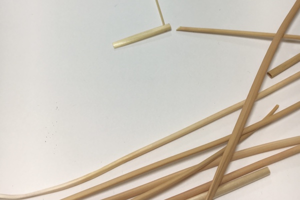 ストロー状の細い管に糸を通して、モチーフを作りそれを組み合わせていきます。材料は主に麦わらが使われています。