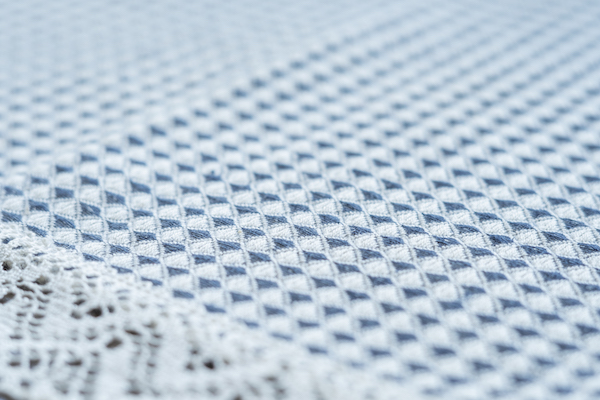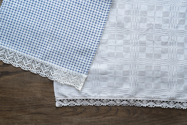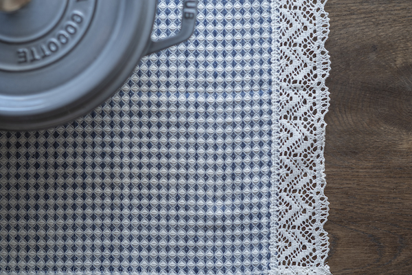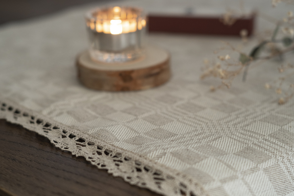 ベージュのクロスは100%リネン。ブルーのクロスはリネンが緯糸、コットンを経糸に使用したもので、このふたつを愛用しています。どちらもほどよい厚みがあるので、ダイニングのテーブルに敷いて、ちょっとした小物を置いたりインテリアのアクセントになるデザイン。
