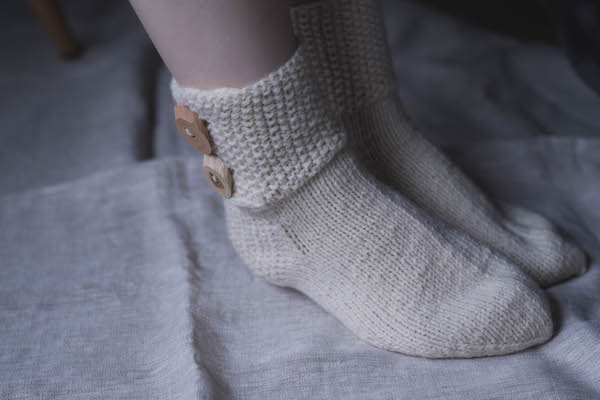 この手編みの靴下もしっかり編み目が詰まっていて、ウールの暖かさが寒さから守ってくれます。